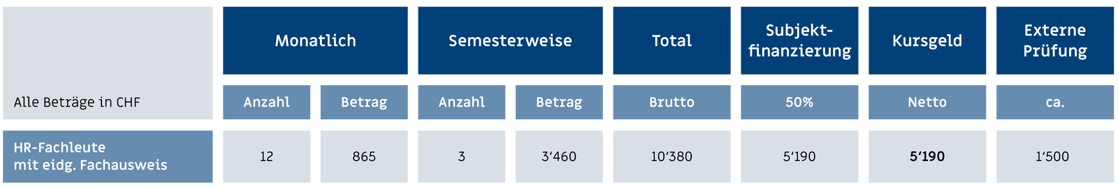 Im Kursgeld sind Unterricht, Lehrmittel, Lernplattform, Fallstudienkorrekturen und Simulationsprüfungen schriftlich und mündlich enthalten. Nicht enthalten sind persönliche Auslagen bei allfälligen Workshops und Seminaren für Verpflegung. Externe Prüfungsgebühren werden direkt an die Prüfungskommission bezahlt. Die Prüfungsgebühren können von Jahr zu Jahr ändern (Stand: 01.05.2020). Preisänderungen bleiben vorbehalten.