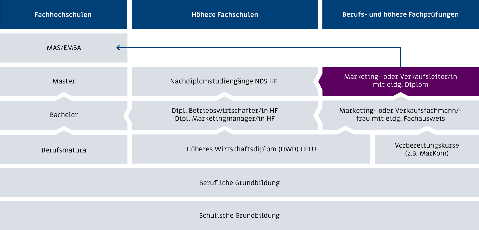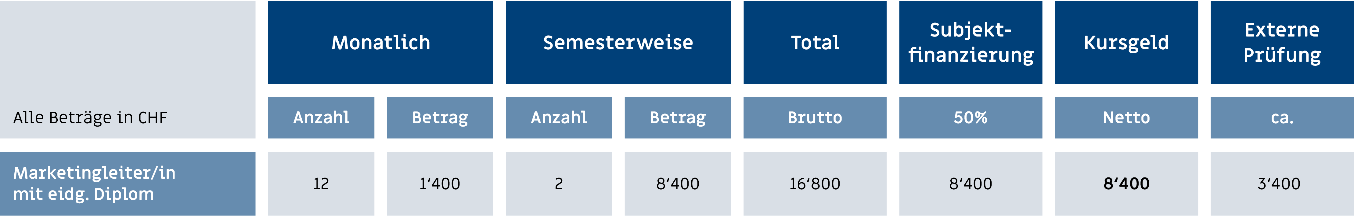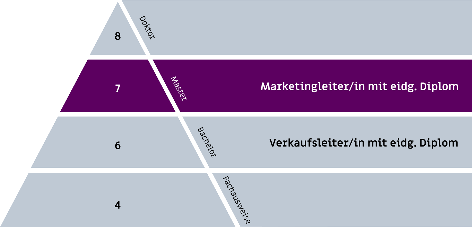 Mit dem Titel Marketing­leiter/in mit eidg. Diplom sind Sie eine aus­gewiesene Fach­kraft. Sie sind befähigt eine leitende Postition in den Bereichen Marketing, Verkauf oder Kommunikation selbst­ständig zu über­nehmen. Mehr zum möglichen Gehalt und Lohn als Marketingleiter/in findest Du hier. Die Aus­bildung als Marketingleiter/in mit eidg. Diplom bildet eine optimale Basis für weiter­führende Weiterbildungen.