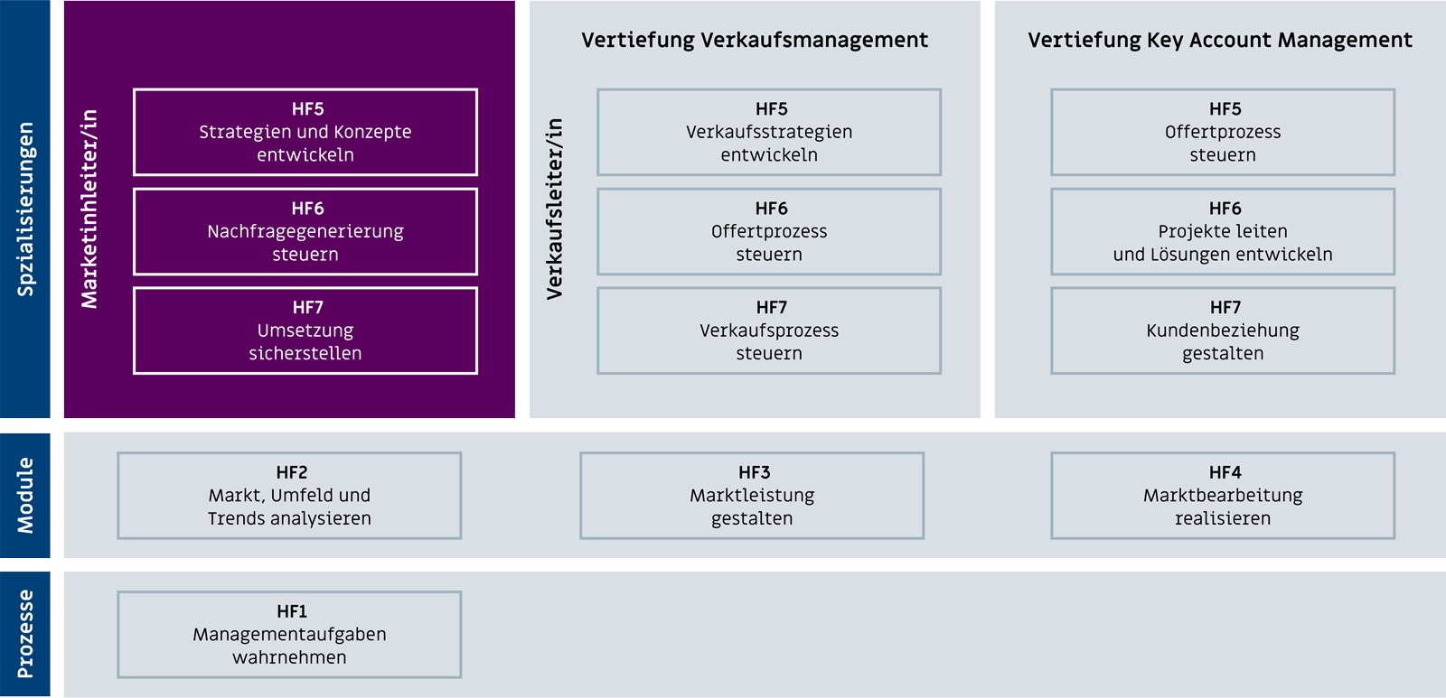 Die Marketing- und Verkaufs­leiter/innen werden in 7 Handlungs­feldern geprüft. Die Handlung­sfelder HF 1 bis und mit HF 4 werden von den Marketing- wie auch von den Verkaufs­leiter/innen abgelegt und bilden die Grund­lage. In den Handlung­sfelder HF 5 bis und mit HF 7 findet die Spezialisierung statt.