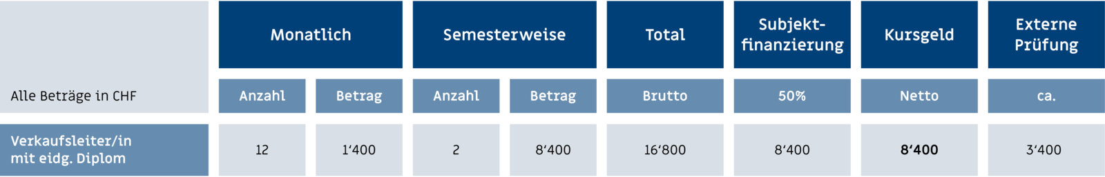 Das innovative Ausbildungskonzept garantiert Ihnen die bestmögliche Vorbereitung auf die eidg. Prüfung der Verkaufsleiter/innen. Sie benötigen keine Vorkurse oder dergleichen - ein duchgehender Bildungsgang - alles aus einem Guss.