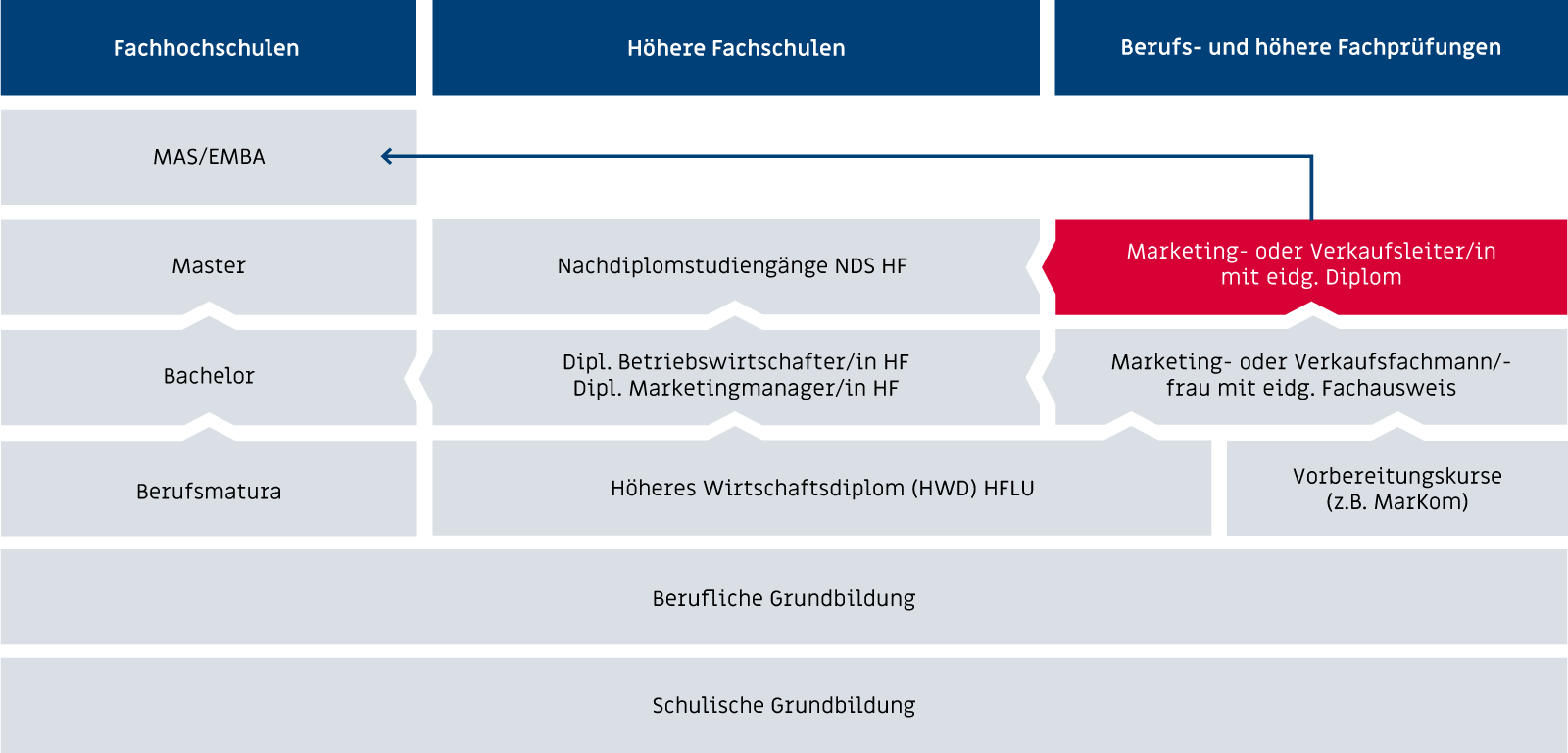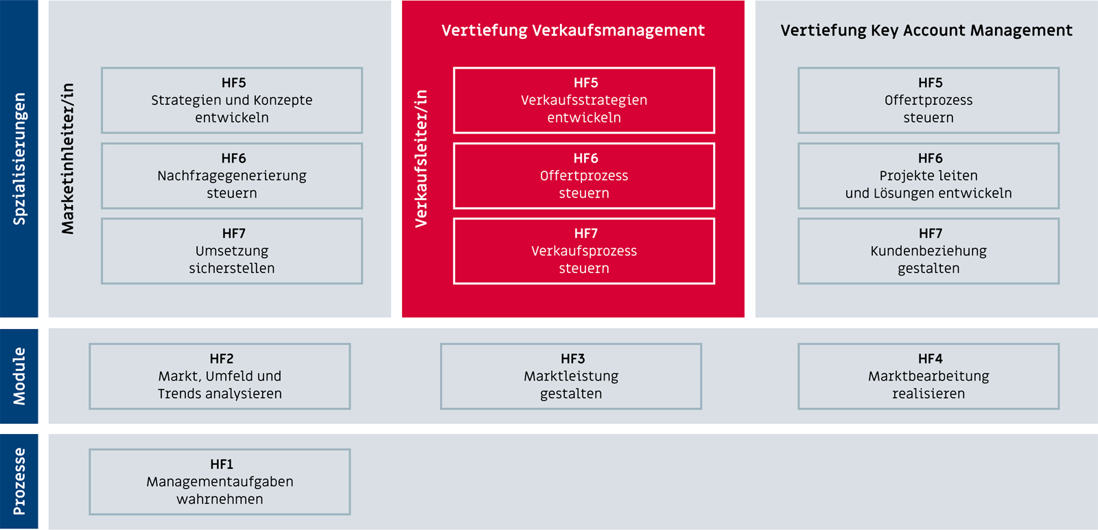Die Marketing- und Verkaufsleiter/innen werden in 7 Handlungsfeldern geprüft. Die Handlungsfelder HF 1 bis und mit HF 4 werden von den Marketing- wie auch von den Verkaufsleiter/innen abgelegt und bilden die Grundlage. In den Handlungsfelder HF 5 bis und mit HF 7 findet die Spezialisierung statt.